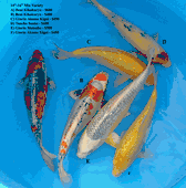 Niigata 987<br> 20" Ginrin Shiro Utsuri <br>$2000 Niigata 988 <br>21"-22" Yamabuki Ogon <br> $1800/eachNiigata 989 <br>25"-26" Showa <br> $2800